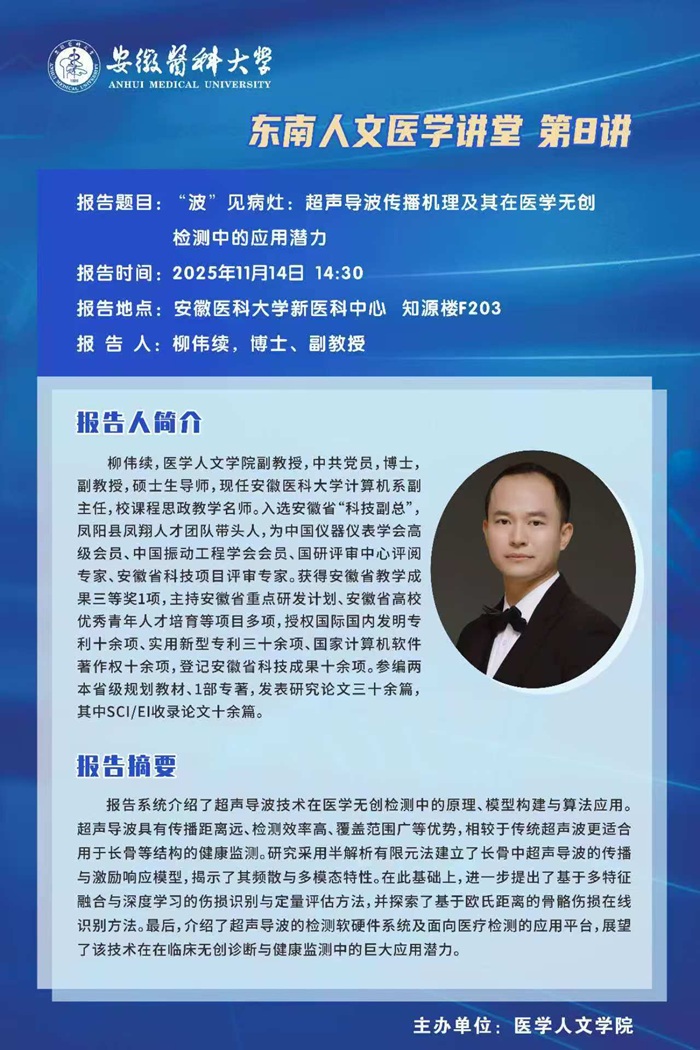 【东南人文医学讲堂第8讲】:“波”见病灶:超声导波传播机理及其在医学无创检测中的应用潜力(柳伟续)